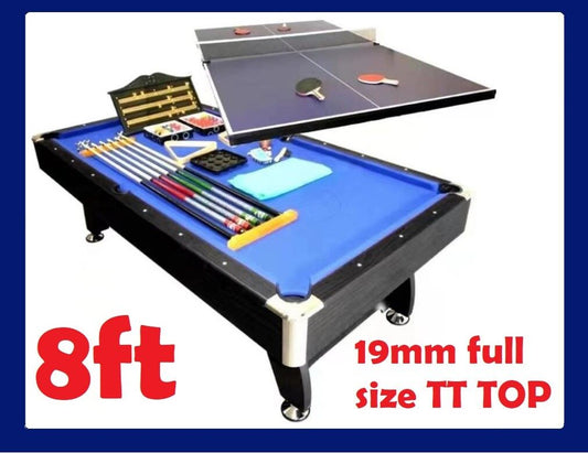 POOL TABLE 8FT SNOOKER BILLIARD TABLE 25mm TABLE TOP - WITH FULL SIZE TABLE TENNIS TOP